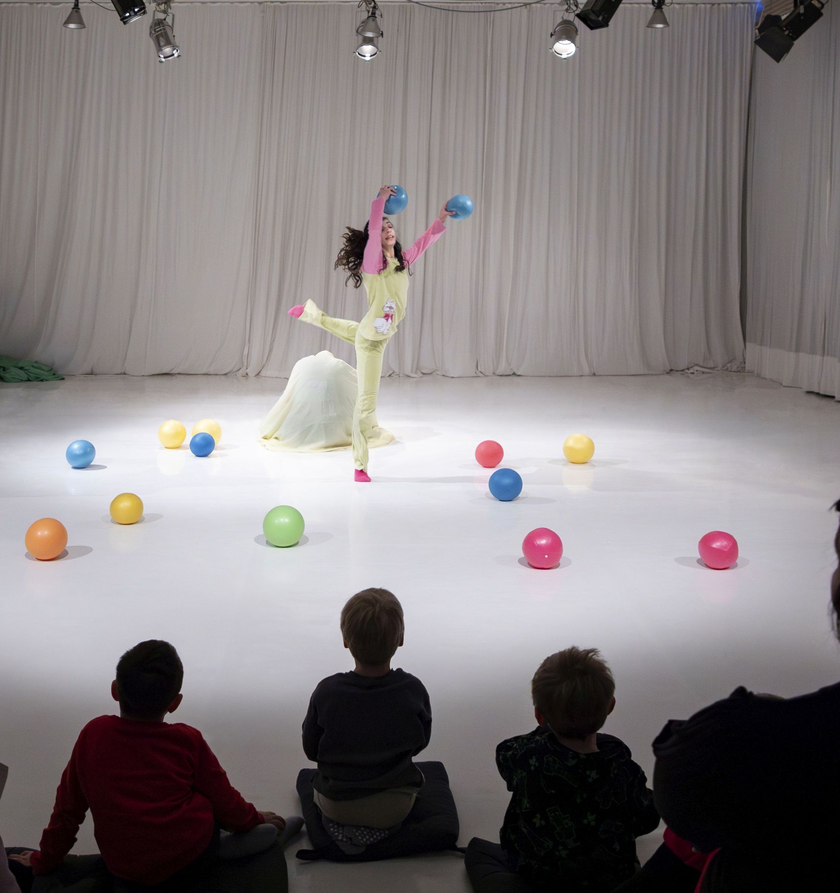 Müde kuschelt sich ein Kind abends in seine Bettdecke….und – SimBallaBim! – erwacht das Kissen zum Leben, verwandelt sich in ein magisches Wesen, zaubert Bälle und vieles mehr hervor und tanzt mit dem Kind durch seine Traumwelt….